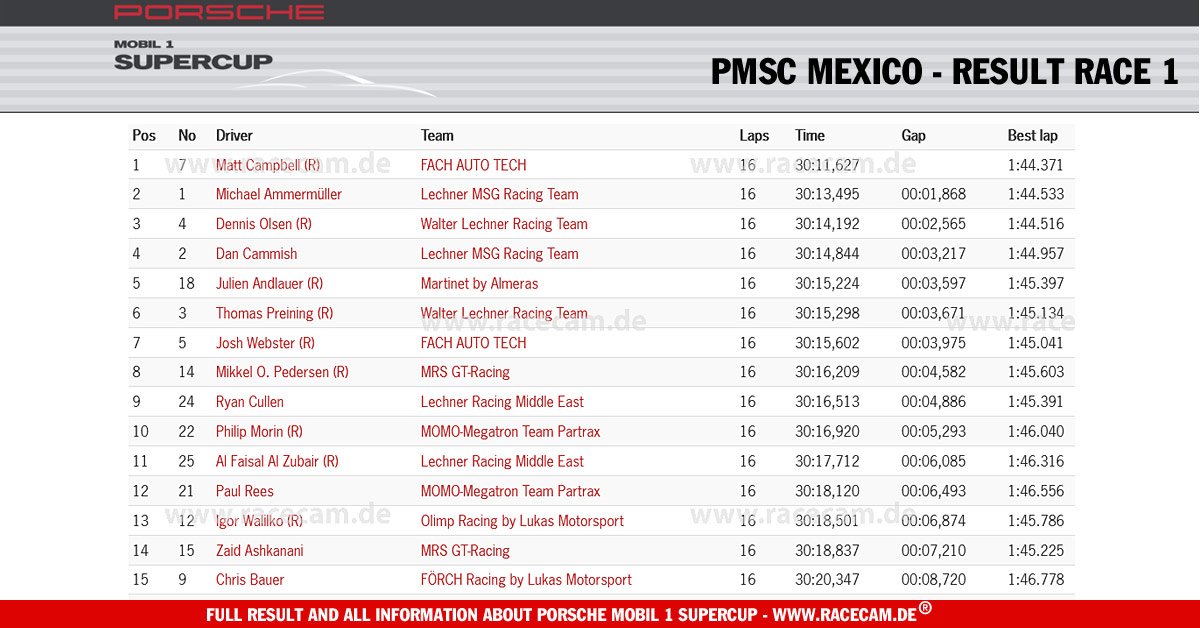 Австралийский юниор Мэтт Кэмпбелл выиграл первую гонку Суперкубка Порше в Мексике. Новичку сезона удалось опередить Олсена на длинной прямой после старта, после чего его лидерству больше ничего не угрожало даже на рестартах.