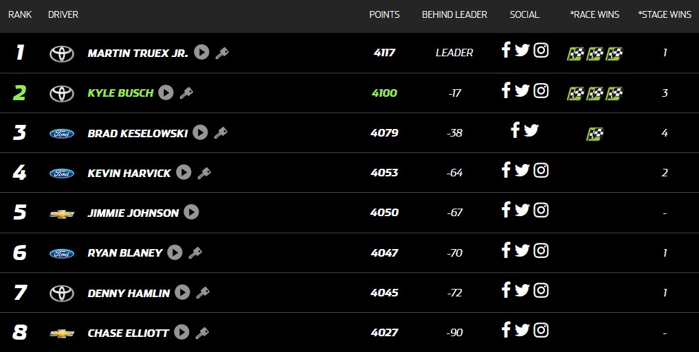 Кайл Буш, победив, отправил себя в финал, а Труэкс, приехавший вторым, фактически гарантировал себе одну гонку без абсолютных проблем. Никто, не сможет его достать, если во второй гонке полуфинала победу одержит Кайл Буш, либо гонщик не из плей-офф, а сам Мартин будет попивать сок (или что он там предпочитает) проехав один круг. Даже так его положение будет лучше, нежели у любого другого спортсмена. Ну, может, за исключением Брэда Кезеловски. Вот так раскрылась цена выигранных сегментов, к которым стремился Мартин, стараясь набрать максимально возможное количество очков.
